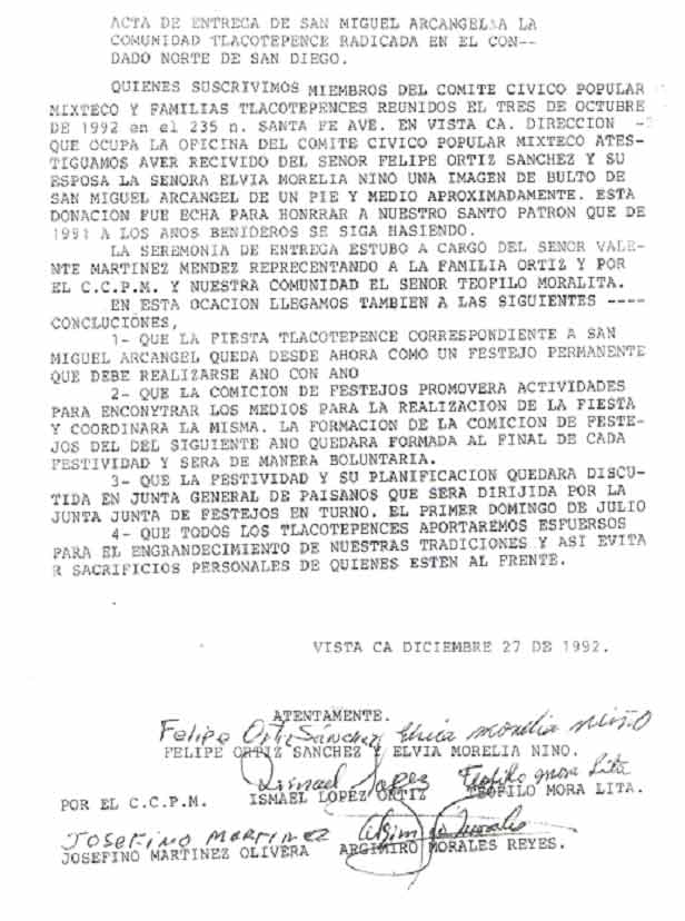 La comunidad Tlacotepence en Vista Ca. No fue ajena a este proceso por lo que todo lo que se a hecho en términos organizativos culturales o políticos de alguna manera esta conectado al Comité Cívico Popular Mixteco. Es así como la fiesta de San Miguel Arcángel en el Condado Norte de San Diego tiene ahi su origen . Es necesario establecer que en el seno del CCPM. Compartíamos una visión crítica sobre las costumbres de nuestro pueblo por las consecuencias negativas que estas ejercían en la economía de nuestra gente, por eso cuando se plantea en el seno del Comité Ejecutivo del CCPM. El impulso de la festividad de San Miguel Arcángel se hace desde un perfil estrictamente comunitario cultural y con responsabilidades colectivas en su desempeño. En eso todos estábamos de acuerdo, sin embargo las posiciones ideológicas nos dividían, el argumento principal de quienes apoyábamos la idea era de que la fiesta de San Miguel era lo que nos permitiría unificar a la comunidad y al CCPM. Misma cosa que al final de cuentas sucedió . Por aquellos días las diferencias internas eran ya muy marcadas y un caso anecdótico fue cuando se planeo hablar con personas mayores para que el plan de hacer la fiesta tuviera el respaldo de la gente grande, fue como se concreto una reunión con el señor Ricardo Moreno a quien se le dijo nuestras intenciones, hombre de hablar apasionado y seguro el tío Ricardo nos dijo que para que queríamos hacer fiestas aquí (en Vista) que en donde deberíamos dar servicio era en el pueblo y así de un plumazo la mayoría del Comité Ejecutivo del CCPM. Se fue a hacer la fiesta de San Miguel a Tlacotepec. Desde un enfoque ideológico que a veces se quería aplicar daba lo mismo hacer la fiesta en Vista O en Tlacotepec, pero de lo que se trataba era de que no prosperara lo que la otra fracción proponía (y esas actitudes siguen hasta nuestros días.) Fue así como el año de 1990 gente del CCPM. Desempeña la fiesta de San Miguel en Tlacotepec. Quedando como mayordoma la señora Juana García Ruiz. Los únicos que no estuvimos de acuerdo con esa decisión y no participamos fuimos el compañero Ismael López y un servidor, esa fue la razón que retraso un año más para que se impulsara la idea original.